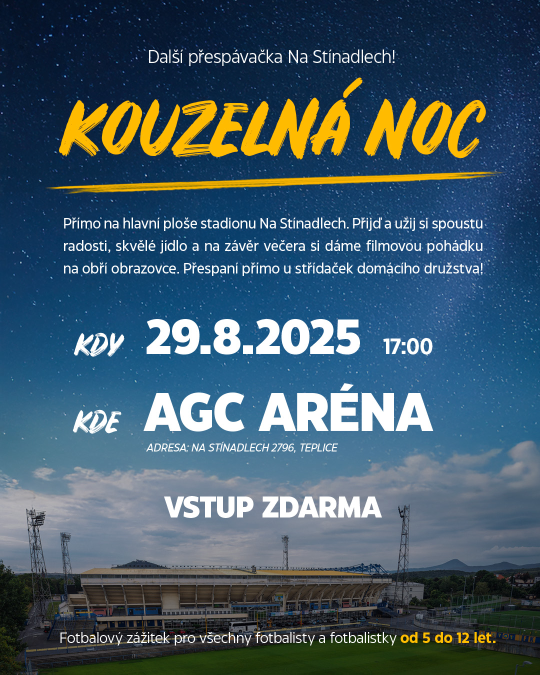 Účastníky čeká nocování ve vlastních stanech postavených přímo u střídaček domácího týmu, takže si budete moci vychutnat atmosféru opravdového fotbalového stadionu i po západu slunce. Program je připraven především pro děti ve věku 5-12 let a zahrnuje zábavné fotbalové hry a soutěže, po kterých přijde na řadu společná večeře. Večer si zpříjemníme promítáním pohádky na velkoplošné obrazovce.
