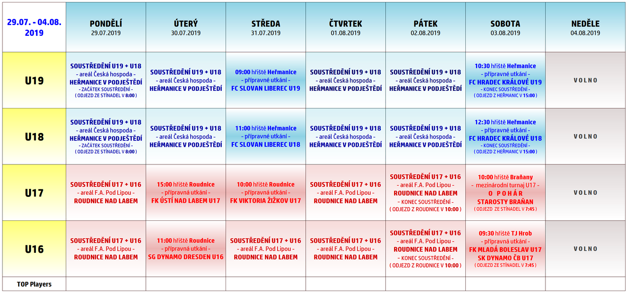 Tréninkový plán dorostů: 29.7. - 4.8.2019
